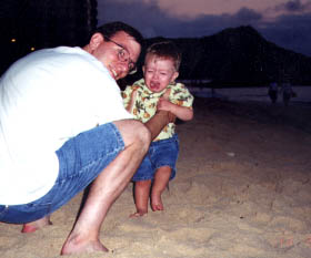 Speaking of Hawaii, we had a great time in Waikiki when we all flew there in October. We stayed right in the middle of all the hotels, shopping, beaches, and Japanese tourists! Riley, however, did not like the beach. We put him down in the sand and he would cry. The lapping waves of the ocean were no better. But, eventually, he got smart; every time we approached the beach he would say "bye, bye sand", "bye bye, beach", "bye bye, water", as if to encourage us to leave. We enjoyed wonderful views from Diamond Head and from the remote areas of the island, in addition to historical sites and many Mai Tais. Kevin even got to see exotica legend Arthur Lyman play his vibes for a rapt audience.